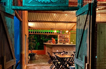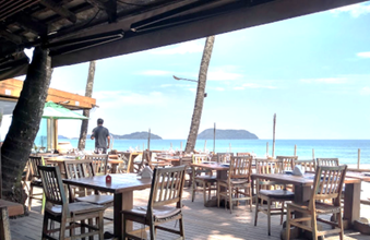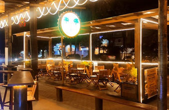 Um maravilhoso bar/restaurante a beira mar, com tendas na areia e um agradável salão.