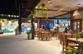 Um maravilhoso bar/restaurante a beira mar, com tendas na areia e um agradável salão.