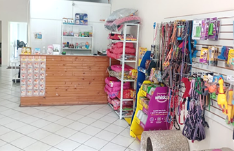Atendimento veterinário, banho e pet-shop com ração e acessórios.